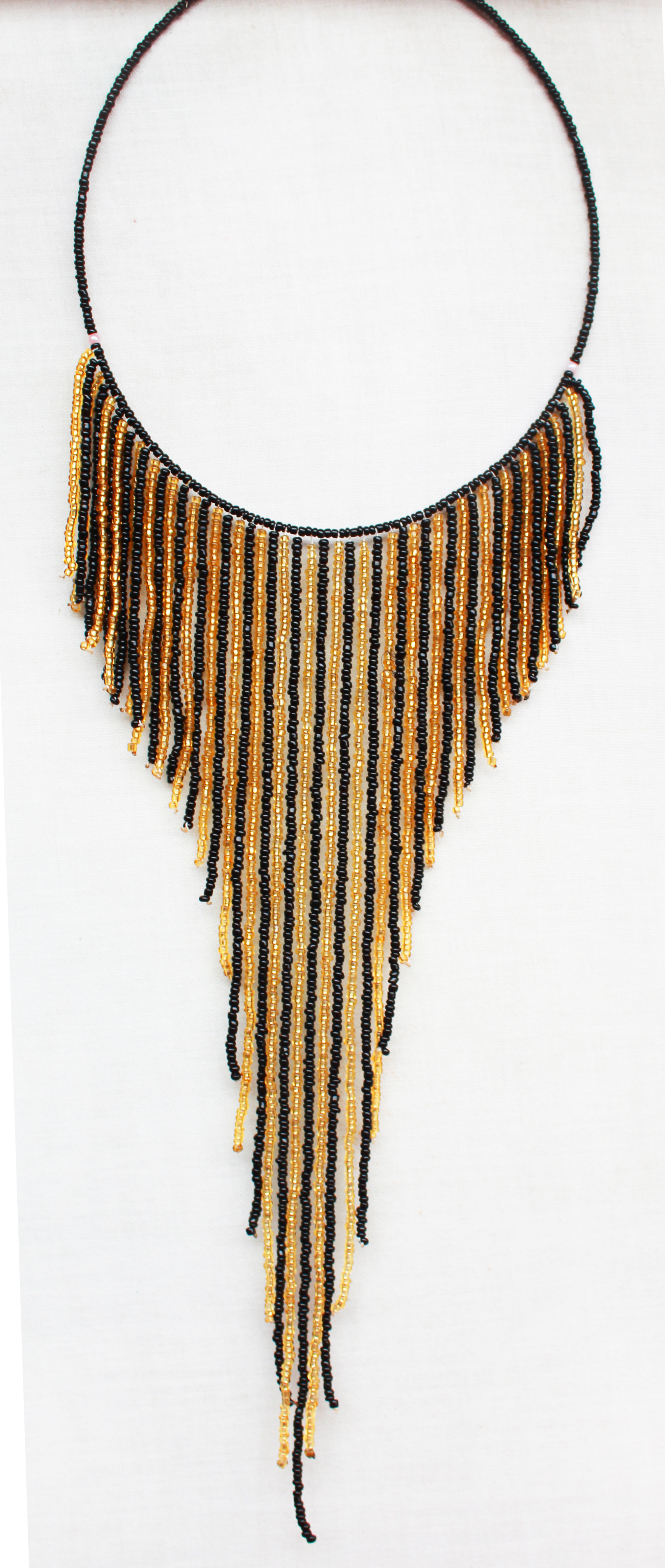 Collier simple pendant avec perles noire et jaune et fil fait à la main et se porte avec divers vêtements à col ouvert.