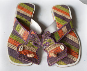 Samara en raphia tissée et décorée avec des cauris et la carte du Cameroun.